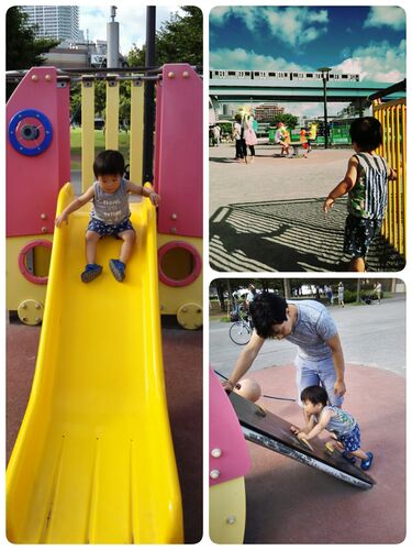 午後から豊洲のららぽーとへ! 夏のセールなので、買い物したーい!!! でも、お互いのためにもここは我慢で公園へGO☆ 今回はじめて豊洲のららぽーとへ行ったのですが、海に面した広場や、じゃぶじゃぶ池のある公園などがあり、芝生が広々していてとっても…